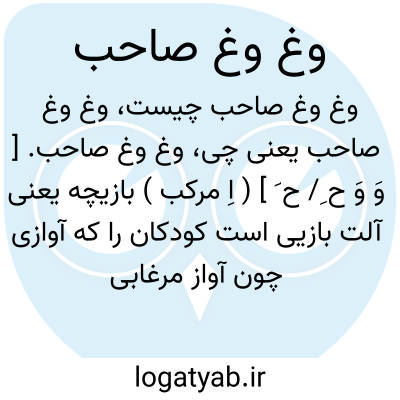 وغ وغ صاحب. [ وَ وَ ح ِ/ ح َ ] ( اِ مرکب ) بازیچه یعنی آلت بازیی است کودکان را که آوازی چون آواز مرغابی از آن برآید. ( یادداشت مرحوم دهخدا ). وغ وغ صاحاب ( در تداول عامه )، آلتی مرکب از دو مقوای مدور که شکل استوانه آن دو را با کاغذ به هم وصل کنند و در داخل آن چند مهره کوچک تعبیه کنند و چون دو قاعده را به هم نزدیک کنند و سپس دورسازند صدایی از آنها برخیزد. ( فرهنگ فارسی معین ).