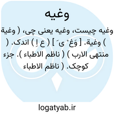 ( وغیة ) وغیة. [ وَغ ْ ی َ ] ( ع اِ ) اندک. ( منتهی الارب ) ( ناظم الاطباء ). جزء کوچک. ( ناظم الاطباء ): وغیة من خیر؛ اندک از خیر. ( منتهی الارب ) ( ناظم الاطباء ).