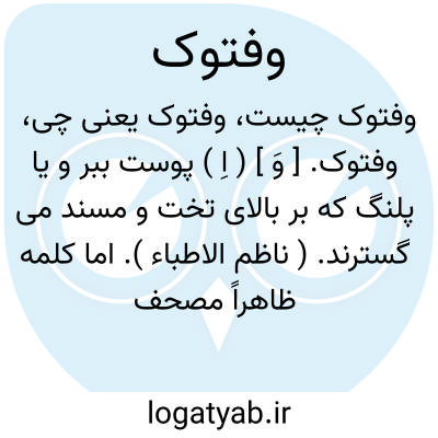 وفتوک. [ وَ ] ( اِ ) پوست ببر و یا پلنگ که بر بالای تخت و مسند می گسترند. ( ناظم الاطباء ). اما کلمه ظاهراً مصحف دفنوک است. ( یادداشت مرحوم دهخدا ). رجوع به دفنوک شود.