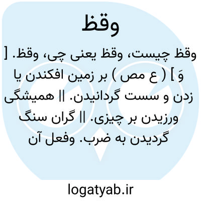وقظ. [ وَ ] ( ع مص ) بر زمین افکندن یا زدن و سست گردانیدن. || همیشگی ورزیدن بر چیزی. || گران سنگ گردیدن به ضرب. وفعل آن به طور مجهول استعمال شود. || ( اِ )حوض خرد که آن را آبگیری باشد که آب بسیار در آن گرد آید. ( از اقرب الموارد ) ( منتهی الارب ) ( آنندراج ).