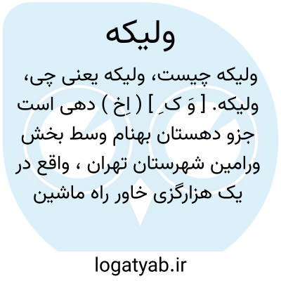 ولیکه. [ وَ ک ِ ] ( اِخ ) دهی است جزو دهستان بهنام وسط بخش ورامین شهرستان تهران، واقع در یک هزارگزی خاور راه ماشین رو خواجه ولی. موقع جغرافیایی آن جلگه و هوای آن معتدل است. سکنه آن 151 تن، آب آن از قنات و محصول آن غلات و صیفی و شغل اهالی زراعت است. ( از فرهنگ جغرافیایی ایران ج 1 ).