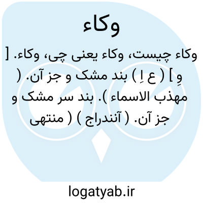 وکاء. [ وِ ] ( ع اِ ) بند مشک و جز آن. ( مهذب الاسماء ). بند سر مشک و جز آن. ( آنندراج ) ( منتهی الارب ) ( اقرب الموارد ). || هر چیزی که سر آن بسته میشود از ظرف و جز آن. ( منتهی الارب ) ( اقرب الموارد ).
