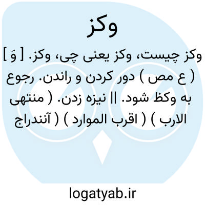 وکز. [ وَ ] ( ع مص ) دور کردن و راندن. رجوع به وکظ شود. || نیزه زدن. ( منتهی الارب ) ( اقرب الموارد ) ( آنندراج ). || مشت زدن. ( منتهی الارب ) ( اقرب الموارد ) ( ترجمان علامه جرجانی ). و گویند با مشت بر چانه زدن. ( اقرب الموارد ). مشت بر زنخ زدن. ( تاج المصادر بیهقی ). || سپوختن. ( منتهی الارب )( آنندراج ). || پر کردن. || دویدن. ( منتهی الارب ) ( اقرب الموارد ) ( آنندراج ). || شکستن. ( اقرب الموارد ): وکز انفه؛ کسره. ( اقرب الموارد ) و فعل آن از باب ضرب آید. ( منتهی الارب ).