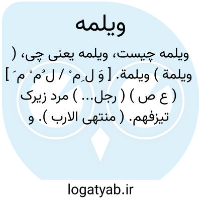 ( ویلمة ) ویلمة. [ وَ ل ِم ْ / ل ُم ْ م َ ] ( ع ص ) ( رجل... ) مرد زیرک تیزفهم. ( منتهی الارب ). و یقال للمستجاد ویلمة؛ ای ویل لامه کقولهم: لا اب لک فرکبوه و جعلوه کالشی الواحد ثم الحقوه الهاء مبالغة کداهیة. ( منتهی الارب ) ( اقرب الموارد ).به کسر لام و ضم آن به معنی داهیة. ( اقرب الموارد ).