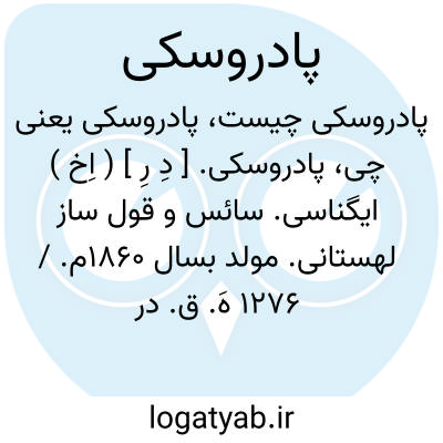 پادروسکی. [ دِ رِ ] ( اِخ ) ایگناسی. سائس و قول ساز لهستانی. مولد بسال 1860م. / 1276 هَ. ق. در کوری لوکا. وی بسال 1941م. / 1338 هَ. ق. ) نخست وزیر جمهوری لهستان بود.