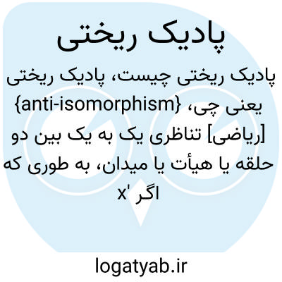 {anti-isomorphism} [ریاضی] تناظری یک به یک بین دو حلقه یا هیأت یا میدان، به طوری که اگـر 'x متناظر x و 'y متناظر y باشد، 'x'+y متناظر x+y شود، ولی 'x'y با yx در تناظر باشد