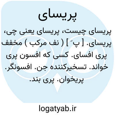 پریسای. [ پ َ ] ( نف مرکب ) مخفف پری افسای. کسی که افسون پری خواند. تسخیرکننده جن. افسونگر. پریخوان. پری بند. عزیمت خوان. عزائم کننده پری: