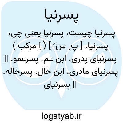 پسرنیا. [ پ ِ س َ ] ( اِ مرکب ) پسرنیای پدری. ابن عم. پسرعمو. || پسرنیای مادری. ابن خال. پسرخاله. || پسرنیای نزدیک. ابن عم لح. || پسرنیای دور. ابن عم کلاله. ( مهذب الاسماء در لفظ ابن ). صاحب برهان قاطع در لفظ نیا گوید: بمعنی جد باشد مطلقاً خواه پدر پدر و خواه پدر مادر و بمعنی برادر مادر که خالو باشد و برادر بزرگ هم بنظر آمده است... - انتهی.