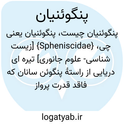 {Spheniscidae} [زیست شناسی- علوم جانوری] تیره ای دریایی از راستۀ پنگوئن سانان که فاقد قدرت پرواز هستند و بدنی ساده دارند که برای شیرجه زدن و شنا در زیر آب سازش یافته است