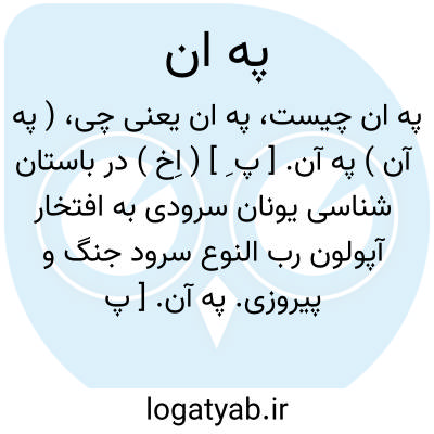 لغت نامه دهخدا ( په آن ) په آن. [ پ ِ ] ( اِخ ) در باستان شناسی یونان سرودی به افتخار آپولون رب النوع سرود جنگ و پیروزی.په آن. [ پ ِ ] ( اِخ ) ( ژول ) جراح فرانسوی. مولد ماربوئه ( اور - اِ - لوار ) ( 1830 - 1898 م. ).په ان. [ پ ِ اُ ] ( اِخ ) پزشک خدایان. وی «مارس » را که بدست «دیوبد» مجروح شده بود، معالجه کرد.