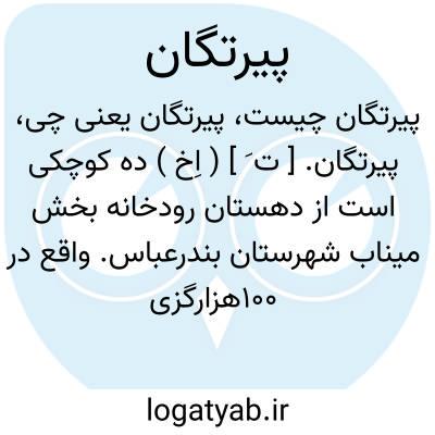 پیرتگان. [ ت َ ] ( اِخ ) ده کوچکی است از دهستان رودخانه بخش میناب شهرستان بندرعباس. واقع در 100هزارگزی شمال میناب، سر راه مالرو میناب به گلاشکرد. دارای 30 تن سکنه. ( فرهنگ جغرافیایی ایران ج 8 ).