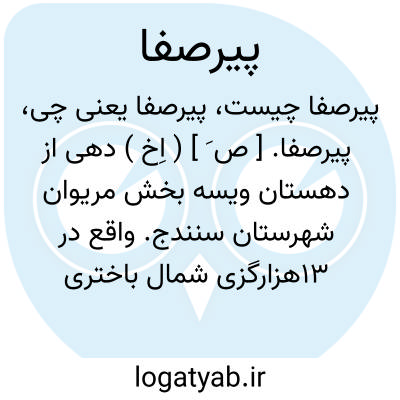 پیرصفا. [ ص َ ] ( اِخ ) دهی از دهستان ویسه بخش مریوان شهرستان سنندج. واقع در 13هزارگزی شمال باختری دژ شاهپور از راه کانی سازان. باختر دریاچه زریوار. دامنه، سردسیر، مرطوب مالاریائی. دارای 120 تن سکنه. آب آن از چشمه. محصول آنجا غلات و برنج و حبوبات و لبنیات. شغل اهالی زراعت و گله داری و راه آن مالرو است. ( فرهنگ جغرافیایی ایران ج 5 ).