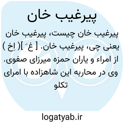 پیرغیب خان. [ غ َ ]( اِخ ) از امراء و یاران حمزه میرزای صفوی. وی در محاربه این شاهزاده با امرای تکلو و ترکمان که در دو فرسنگی سلطانیه بسال 990 هَ. ق. روی داد شرکت داشته است. ( سبک شناسی ج 3 ص 283 نقل از عالم آرای عباسی ).
