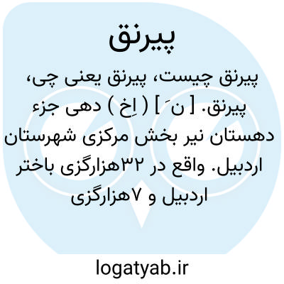 پیرنق. [ ن َ ] ( اِخ ) دهی جزء دهستان نیر بخش مرکزی شهرستان اردبیل. واقع در 32هزارگزی باختر اردبیل و 7هزارگزی شوسه تبریز به اردبیل. کوهستانی، معتدل، دارای 635 تن سکنه. آب آن از رودخانه آغلفان. محصول آنجا غله و حبوبات. شغل اهالی زراعت و گله داری و راه آن مالرو است. ( فرهنگ جغرافیایی ایران ج 4 ).