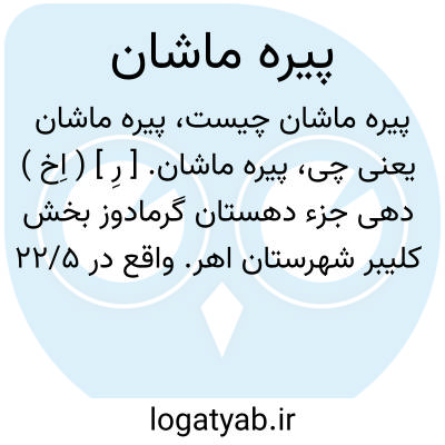 پیره ماشان. [ رِ ] ( اِخ ) دهی جزء دهستان گرمادوز بخش کلیبر شهرستان اهر. واقع در 22/5 هزارگزی شمال کلیبر و 22/5 هزارگزی شوسه اهر به کلیبر. کوهستانی، معتدل. دارای 457 تن سکنه. آب آن از چشمه و رودخانه سلین، محصول آنجا غلات و حبوبات. شغل اهالی زراعت و گله داری. صنایع دستی زنان گلیم و فرش بافی. راه آن مالرو است. ( فرهنگ جغرافیایی ایران ج 4 ).
