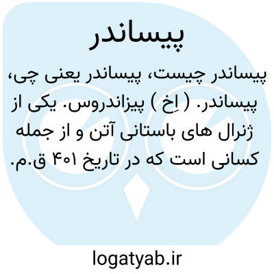 پیساندر. ( اِخ ) پیزاندروس. یکی از ژنرال های باستانی آتن و از جمله کسانی است که در تاریخ 401 ق.م. جمهوری آن شهر را لغو و یک هیأت حاکمه مرکب از 400 تن تشکیل کرد. ( قاموس الاعلام ترکی ). نیز رجوع به پیزاندروس شود.