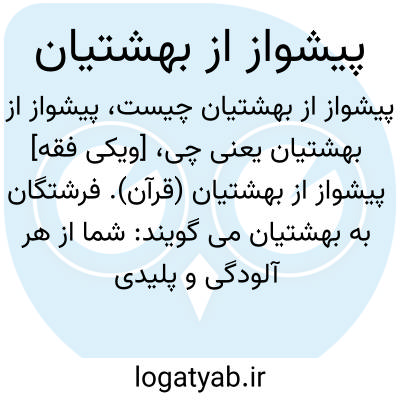 [ویکی فقه] پیشواز از بهشتیان (قرآن). فرشتگان به بهشتیان می گویند: شما از هر آلودگی و پلیدی پاک شده اید، و با ایمان و عمل صالح قلب و روح شما پاک گردیده، و از گناهان و معاصی نیز پاک شده اید، و بر در بهشت درختی است که دو چشمه آب زلال از پای آن می جوشد، مؤمنان از یک چشمه می نوشند و باطن آنها پاک می شود، و در چشمه دیگری خود را شستشو می دهند و ظاهر آنها پاک می شود، و اینجاست که خازنان بهشت به آنها می گویند «سلام علیکم طبتم فادخلوها خالدین».