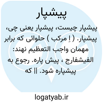 لغت نامه دهخدا پیشپار. ( اِ مرکب ) حلوائی که برابر مهمان واجب التعظیم نهند: الفیشفارج، پیش پاره. رجوع به پیشپاره شود. || که قسمت قدامی وی دریده باشد. پیشپاره.