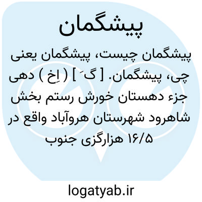 پیشگمان. [ گ َ ] ( اِخ ) دهی جزء دهستان خورش رستم بخش شاهرود شهرستان هروآباد واقع در 16/5 هزارگزی جنوب خاوری هشچین و 38 هزارگزی شوسه هروآباد به میانه. کوهستانی، معتدل، دارای 76 تن سکنه. آب آن از چشمه. محصول آنجا غلات. شغل اهالی آن زراعت و گله داری. صنایع دستی جاجیم بافی و راه آنجا مالرو است. ( فرهنگ جغرافیائی ایران ج 4 ).