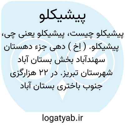 پیشیکلو. ( اِخ ) دهی جزء دهستان سهندآباد بخش بستان آباد شهرستان تبریز. در 22 هزارگزی جنوب باختری بستان آباد و 12 هزارگزی شوسه بستان آباد به تبریز. کوهستان، سردسیر - دارای 516 تن سکنه آب آن از رودخانه علی بلاغ. محصول آن غلات. شغل اهالی آنجا زراعت و گله داری و راه آن مالروست. ( فرهنگ جغرافیائی ایران ج 4 ).