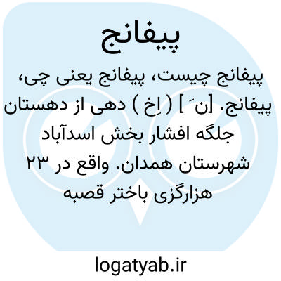پیفانج. [ن َ ] ( اِخ ) دهی از دهستان جلگه افشار بخش اسدآباد شهرستان همدان. واقع در 23 هزارگزی باختر قصبه اسدآباد و 2 هزارگزی شوسه اسدآباد به کنگاور. جلگه، سردسیر، دارای 390 تن سکنه. آب آن از چشمه، محصول آنجا غلات و لبنیات مختصر و انگور. شغل اهالی آن زراعت و گله داری. صنایع دستی زنان آنجا جاجیم بافی و راه آن در فصل خشکی اتومبیل روست. ( فرهنگ جغرافیائی ایران ج 5 ).