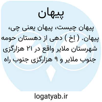 پیهان. ( اِخ ) دهی از دهستان حومه شهرستان ملایر واقع در 21 هزارگزی جنوب ملایر و 9 هزارگزی جنوب راه شوسه ملایر به اراک. جلگه، معتدل مالاریائی. دارای 413تن سکنه. آب آن از رودخانه محصول آنجا غلات و صیفی. شغل اهالی آن زراعت و صنایع دستی قالی باقی است و راه فرعی به شوسه دارد. ( فرهنگ جغرافیائی ایران ج 5 ).
