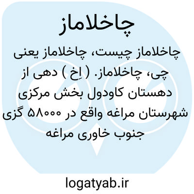 چاخلاماز. ( اِخ ) دهی از دهستان کاودول بخش مرکزی شهرستان مراغه واقع در 58000 گزی جنوب خاوری مراغه درمسیر ارابه رو میاندواب به شاهین دژ. جلگه، معتدل، مالاریائی با 363 تن سکنه. آب آن از قوریچای و زرینه رود، محصول آنجا غلات و کشمش و بادام و چغندر و حبوبات، شغل اهالی زراعت، صنایع دستی پارچه و جاجیم بافی، راه آن مالرو است. ( فرهنگ جغرافیایی ایران ج 4 ص 153 ).