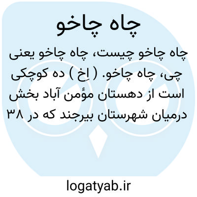 چاه چاخو. ( اِخ ) ده کوچکی است از دهستان مؤمن آباد بخش درمیان شهرستان بیرجند که در 38 هزارگزی جنوب باختری در میان و 4 هزارگزی باختر شوسه عمومی بیرجند بزاهدان واقع شده. جلگه و گرمسیر است و9 تن سکنه دارد. ( از فرهنگ جغرافیایی ایران ج 9 ).