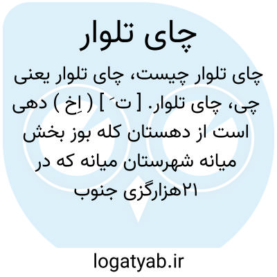 چای تلوار. [ ت َ ] ( اِخ ) دهی است از دهستان کله بوز بخش میانه شهرستان میانه که در 21هزارگزی جنوب باختری میانه و 12هزارگزی خط آهن میانه بمراغه و 21هزارگزی راه شوسه تبریز بمیانه واقع شده. کوهستانی و معتدل است و 182 تن سکنه دارد. آبش از چشمه، محصولش غلات، حبوبات، پنبه، برنج و بادام، شغل اهالی زراعت و گله داری وراهش مالرو است. ( از فرهنگ جغرافیایی ایران ج 4 ).