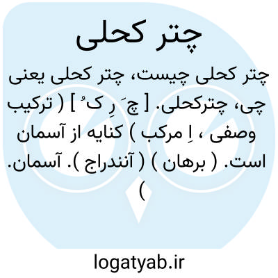 چترکحلی. [ چ َ رِ ک ُ ] ( ترکیب وصفی، اِ مرکب ) کنایه از آسمان است. ( برهان ) ( آنندراج ). آسمان. ( ناظم الاطباء ). برای آسمان استعمال کنند. ( از فرهنگ نظام ).کنایه از آفتاب است. ( انجمن آرا ). || ابرسیاه را نیز گویند. ( برهان ) ( ناظم الاطباء ). کنایه از ابر سیاه. ( آنندراج ). || کنایه از شب. ( آنندراج ). برای شب استعمال کنند. ( از فرهنگ نظام ).