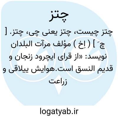 چتز. [ چ َ ] ( اِخ ) مؤلف مرآت البلدان نویسد: «از قرای ایچرود زنجان و قدیم النسق است.هوایش ییلاقی و زراعت آن آبی و دیمی است. چشمه ای در کنار قریه است که قدری از زراعت و صیفی آنرا مشروب میسازد. این آبادی دارای 45 خانوار سکنه است و قدری اشجار میوه نیز دارد». ( از مرآت البلدان ج 4 ص 214 ).