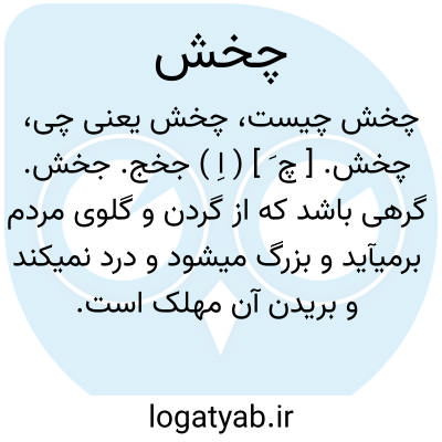 چخش. [ چ َ ] ( اِ ) جخج. جخش. گرهی باشد که از گردن و گلوی مردم برمیآید و بزرگ میشود و درد نمیکند و بریدن آن مهلک است. ( برهان ) ( آنندراج ). جخج.گواتر. ( ناظم الاطباء ). چخج. ( شعوری ). سلعه. خوک. خوکک. علتی باشد مانند بادنجان که از گلو و گردن مردم برآید و درد نکند و در بریدنش احتمال هلاکت رود. آماس گلو. نوعی غده کوچک یا بزرگ که غالباً از گردن و زیر گلو برمیآید، و چرکین و دردناک نیست اما موجب زشتی و مخل زیبائی است، و درقدیم بریدن آن مایه هلاکت بوده ولی حالا جراحان آنرابآسانی عمل کنند و آثارش را محو سازند:
