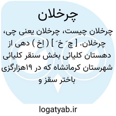 چرخلان. [ چ َ خ َ ] ( اِخ ) دهی از دهستان کلیائی بخش سنقر کلیائی شهرستان کرمانشاه که در 19هزارگزی باختر سقز و 2هزارگزی جنوب مرزاله واقع است. دامنه و سردسیر است و 25 تن سکنه دارد. آبش از چشمه، محصولش غلات، حبوبات و توتون، شغل اهالی زراعت و بافتن قالیچه، جاجیم و پلاس وراهش مالرو است. ( از فرهنگ جغرافیایی ایران ج 5 ).