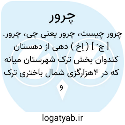 چرور. [ چ َ ] ( اِخ ) دهی از دهستان کندوان بخش ترک شهرستان میانه که در 4هزارگزی شمال باختری ترک و 15هزارگزی راه شوسه میانه به تبریز واقع است. کوهستانی و هوایش معتدل است و 848 تن سکنه دارد. آبش از چشمه و رود ترک و محصولش غلات، عدس و نخود، شغل اهالی زراعت و گله داری و راهش مالرو است. ( از فرهنگ جغرافیایی ایران ج 4 ).