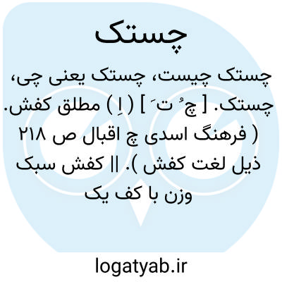 چستک. [ چ ُ ت َ ] ( اِ ) مطلق کفش. ( فرهنگ اسدی چ اقبال ص 218 ذیل لغت کفش ). || کفش سبک وزن با کف یک لا که در خانه پوشند. کفش راحتی. چسک. کفش سرپایی. رجوع به چسک شود. چستک. [ چ ِ ت َ ] ( اِخ ) دهی از دهستان مؤمن آباد بخش درمیان شهرستان بیرجند که در 37هزارگزی جنوب خاوری درمیان، بر سر راه مالرو عمومی اسفید به خلبران واقع است. جلگه و گرمسیر است و 23 تن سکنه دارد. آبش از قنات، محصولش غلات،لبنیات، شلغم و چغندر، شغل اهالی زراعت و مالداری وراهش مالرو است. ( از فرهنگ جغرافیایی ایران ج 9 ).