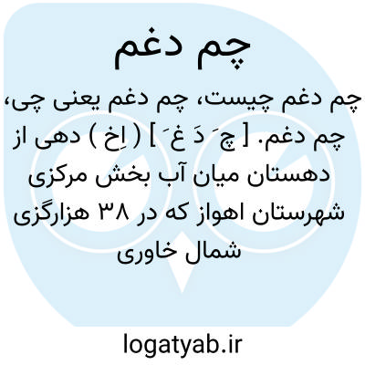چم دغم. [ چ َ دَ غ َ ] ( اِخ ) دهی از دهستان میان آب بخش مرکزی شهرستان اهواز که در 38 هزارگزی شمال خاوری اهواز و 19 هزارگزی خاور راه آهن، در کنار کارون واقع است. دشت و گرمسیر است و 57 تن سکنه دارد. آبش از رودخانه دز و کارون. محصولش غلات و لبنیات. شغل اهالی زراعت و گله داری، صنایع دستی قالیچه بافی و راهش در تابستان اتومبیل رو است. در نزدیک این آبادی نیز آثاری از نهر بسیار قدیمی دیده میشود. ( از فرهنگ جغرافیایی ایران ج 2 ).