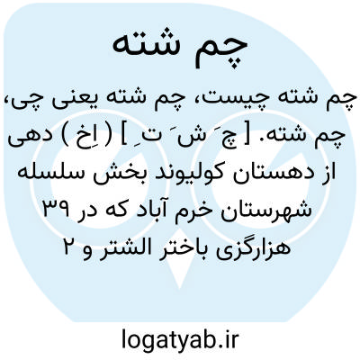 چم شته. [ چ َ ش َ ت ِ ] ( اِخ ) دهی از دهستان کولیوند بخش سلسله شهرستان خرم آباد که در 39 هزارگزی باختر الشتر و 2 هزارگزی خاور راه شوسه خرم آباد به کرمانشاه واقع است. دامنه و سردسیر است و 120 تن سکنه دارد. آبش از چشمه ها. محصولش غلات، حبوبات و لبنیات. شغل اهالی زراعت و گله داری و راهش مالرو است. ساکنین این آبادی از طایفه کولیوند میباشند. ( از فرهنگ جغرافیایی ایران ج 6 ).