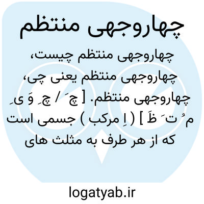 چهاروجهی منتظم. [ چ َ / چ ِ وَ ی ِ م ُ ت َ ظَ ] ( اِ مرکب ) جسمی است که از هر طرف به مثلث های متساوی الاضلاع مسطح برابر محدود میباشد هر یک از این مثلث های متساوی الاضلاع مسطح را وجه مینامند و هر یک از اضلاع مشترک میان وجه را یال و انتهای یالها را رأس های چهاروجهی خوانند. در چهاروجهی منتظم شش یال و چهار رأس وجود دارد و در هر رأس سه مثلث متساوی الاضلاع برابر دیده میشود. مساحت هر چهاروجهی منتظم عبارت است از: مجموع مساحت های وجوه آن. در چهاروجهی منتظم یالها و وجوه با هم برابرند.