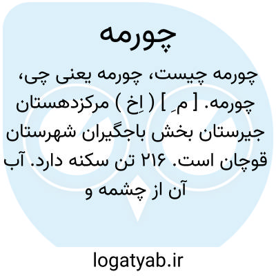 چورمه. [ م ِ ] ( اِخ ) مرکزدهستان جیرستان بخش باجگیران شهرستان قوچان است. 216 تن سکنه دارد. آب آن از چشمه و محصول عمده اش غلات وانواع میوه هاست. ( از فرهنگ جغرافیایی ایران ج 9 ).