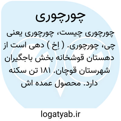چورچوری. ( اِخ ) دهی است از دهستان قوشخانه بخش باجگیران شهرستان قوچان. 181 تن سکنه دارد. محصول عمده اش غلات و بنشن است. ( از فرهنگ جغرافیایی ایران ج 9 ).