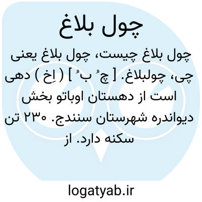 چولبلاغ. [ چ ُ ب ُ ] ( اِخ ) دهی است از دهستان اوباتو بخش دیواندره شهرستان سنندج. 230 تن سکنه دارد. از رودخانه و چشمه آبیاری میشود. محصولش غلات، حبوبات، لبنیات و توتون است. ( از فرهنگ جغرافیایی ایران ج 5 ).