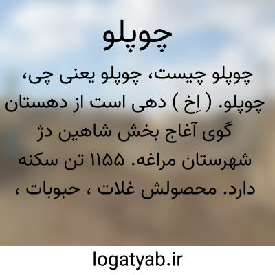 چوپلو. ( اِخ ) دهی است از دهستان گوی آغاج بخش شاهین دژ شهرستان مراغه. 1155 تن سکنه دارد. محصولش غلات، حبوبات، بادام،کرچک و ذرت است. ( از فرهنگ جغرافیایی ایران ج 4 ).