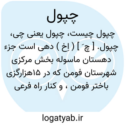 چپول. [ چ َ ] ( اِخ ) دهی است جزء دهستان ماسوله بخش مرکزی شهرستان فومن که در 15هزارگزی باختر فومن، و کنار راه فرعی اتومبیل رو فومن به ماسوله واقع شده. کوهستانی، معتدل و مرطوب است و 122 تن سکنه دارد. آبش از رودخانه ماسوله، محصولش برنج، ابریشم و لبنیات، شغل اهالی زراعت و بافتن جاجیم و جوراب است. ( از فرهنگ جغرافیایی ایران ج 2 ).