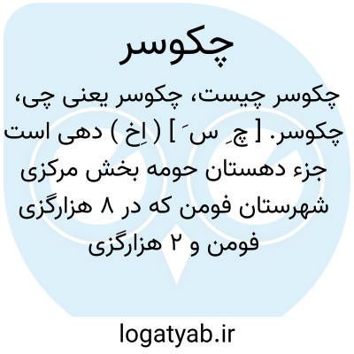 چکوسر. [ چ ِ س َ ] ( اِخ ) دهی است جزء دهستان حومه بخش مرکزی شهرستان فومن که در 8 هزارگزی فومن و 2 هزارگزی شمال شفت که راه فرعی دارد واقع است. جلگه و مرطوب و هوایش معتدل است و 1105 تن سکنه دارد. آبش از رودخانه شفت و استخر. محصولش برنج،چای، ابریشم و جالیز. شغل اهالی زراعت و زغال فروشی و راهش مالرو است. ( از فرهنگ جغرافیای ایران ج 2 ).