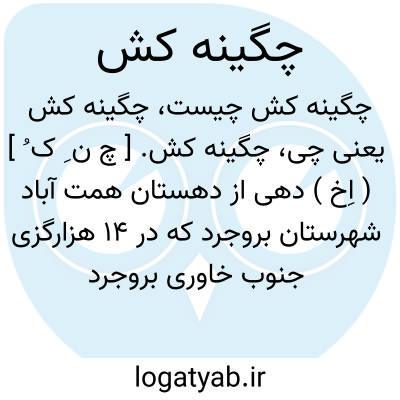 چگینه کش. [ چ ن ِ ک ُ ] ( اِخ ) دهی از دهستان همت آباد شهرستان بروجرد که در 14 هزارگزی جنوب خاوری بروجرد و 7 هزارگزی خاور راه شوسه بروجرد به دورودواقع است. جلگه و معتدل است و 117 تن سکنه دارد. آبش از رودخانه. محصولش غلات و برنج. شغل اهالی زراعت وراهش مالرو است. ( از فرهنگ جغرافیایی ایران ج 6 ).