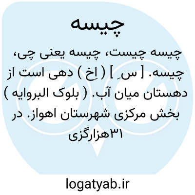چیسه. [ س ِ ] ( اِخ ) دهی است از دهستان میان آب. ( بلوک البروایه ) بخش مرکزی شهرستان اهواز. در 31هزارگزی شمال باختری اهواز واقع است و 200تن سکنه دارد از چاه آبیاری میشود ساکنین از طایفه ٔالبروایه هستند. ( از فرهنگ جغرافیایی ایران ج 6 ).