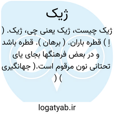 ژیک. ( اِ ) قطره باران. ( برهان ). قطره باشد و در بعض فرهنگها بجای یای تحتانی نون مرقوم است.( جهانگیری ) ( رشیدی ). ژنگ. || بمعنی خارپشت هم آمده است لیکن اشاره به حرکتش نشده. ( برهان ).
