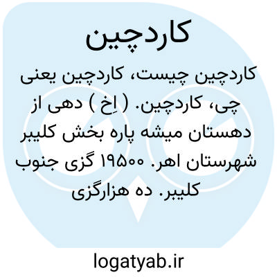 کاردچین. ( اِخ ) دهی از دهستان میشه پاره بخش کلیبر شهرستان اهر. 19500 گزی جنوب کلیبر. ده هزارگزی شوسه اهر کلیبر. کوهستانی و معتدل است. سکنه آن 75 تن باشد. آب از دو رشته چشمه دارد. محصول آن غلات و شغل اهالی زراعت و گله داری و صنایع دستی آن گلیم بافی و راهش مالرو است. ( از فرهنگ جغرافیایی ایران ج 4 ).