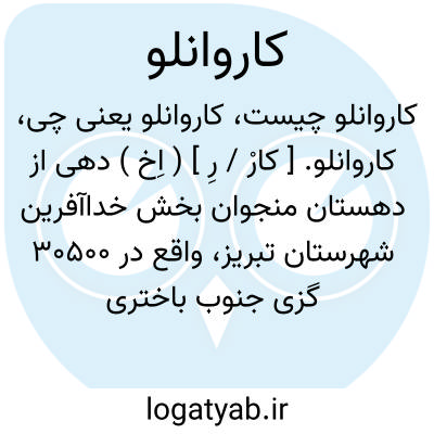 کاروانلو. [ کارْ / رِ ] ( اِخ ) دهی از دهستان منجوان بخش خداآفرین شهرستان تبریز، واقع در 30500 گزی جنوب باختری خداآفرین و 31هزارگزی شوسه اهر به کلیبر. کوهستانی و گرمسیر مالاریائی و دارای 68 تن سکنه است. آب آن از چشمه و رودخانه ارس تأمین می شود. محصول آن غلات و پنبه و حبوبات و شغل اهالی زراعت و گله داری است.راه مالرو دارد. ( از فرهنگ جغرافیایی ایران ج 4 ).