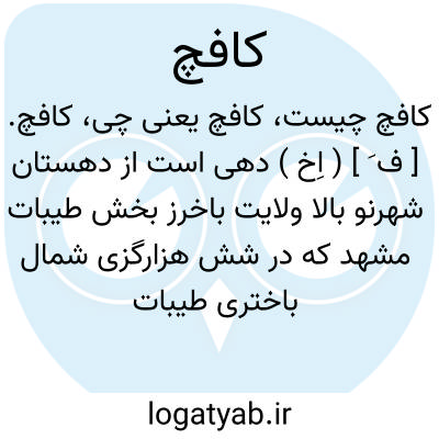 کافچ. [ ف َ ] ( اِخ ) دهی است از دهستان شهرنو بالا ولایت باخرز بخش طیبات مشهد که در شش هزارگزی شمال باختری طیبات واقع است جلگه ای است و آب و هوای معتدل دارد اراضی آن از آب رودخانه مشروب میشود، محصول آن غلات، تریاک، بنشن و شغل اهالی زراعت و مالداری است. و راههای آن مالرو است. ( از فرهنگ جغرافیائی ایران ج 9 ).